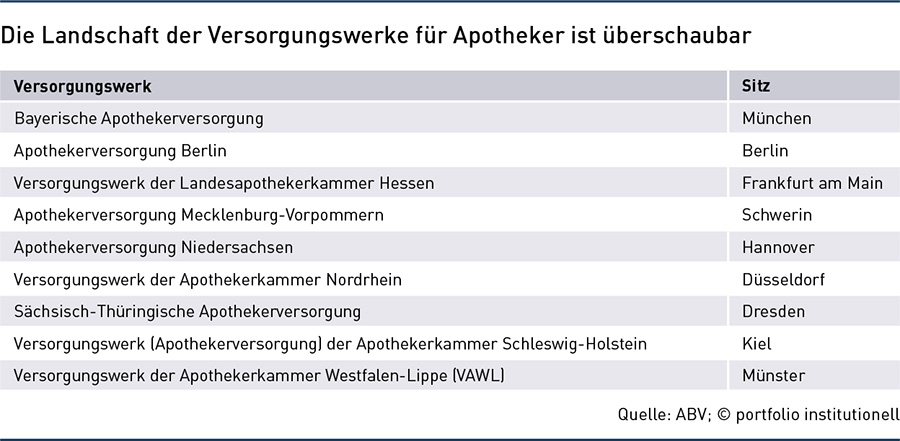 Im vergangenen Jahr gab es bei den Dresdnern an einer anderen wichtigen Stellschraube der berufsständischen Versorgung ein Novum. Seither steuert die Verwaltungsgemeinschaft für Versorgungswerke (VGV), ein Zusammenschluss von acht berufsständischen Versorgungswerken der verkammerten Freien Berufe mit etwa 200.000 Versicherten, auf der Grundlage einer vertraglichen Vereinbarung die versicherungsmathematische Betreuung der Sächsisch-Thüringischen Apothekerversorgung. Damit ging eine Epoche zu Ende. Nach über 30-jähriger Betreuung durch die Bayerische Apothekerversorgung übernahm die in Berlin ansässige VGV die versicherungsmathematische Betreuung des Versorgungswerks. Während die VGVler die Versicherungsmathematik der Apotheker in Thüringen und Sachsen durchrechnen, kümmert sich die BVK unverändert um deren Kapitalanlagen-Mixtur.