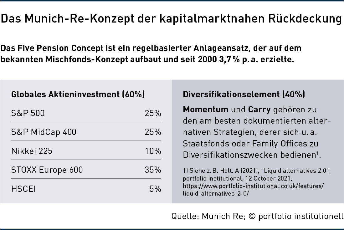 Das Kapitalanlagekonzept sei eng auf die Bedürfnisse der Unternehmen ausgerichtet und biete Zugang zur globalen Expertise von WTW Investment beim Aufbau und der Verwaltung von Pensionsvermögen; man verwaltet mehr als 150 Milliarden Euro. Dadurch könne man das Anlageportfolio jeweils optimal auf den Bestand der Versorgungsberechtigten zuschneiden, darunter 40 Prozent in Alternatives und Sachwerte.