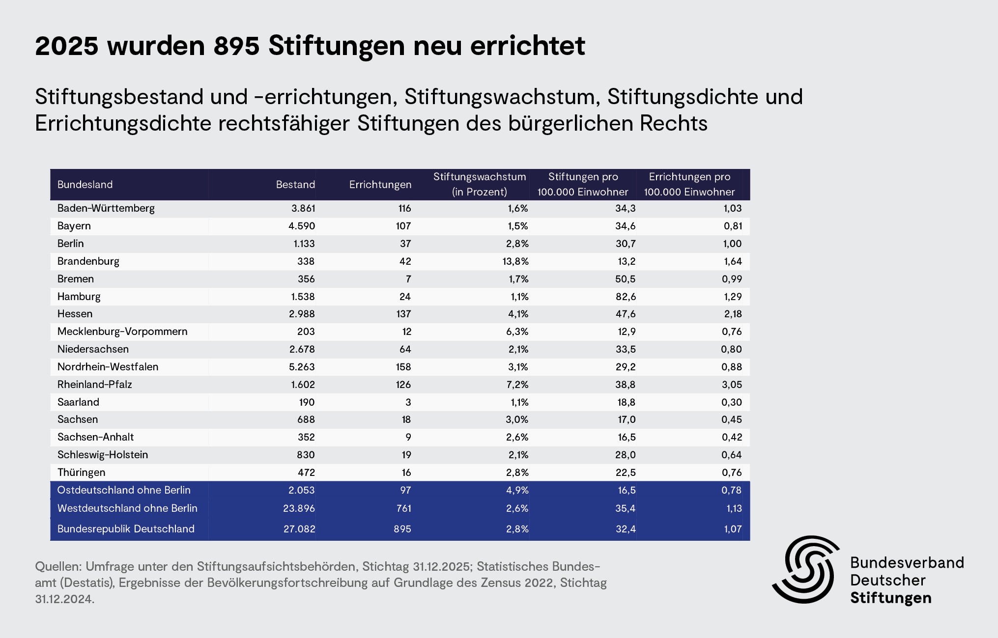 Im Jahr 2025 sind in Deutschland 895 neue rechtsfähige Stiftungen bürgerlichen Rechts gegründet worden. Das ist ein Zuwachs von 2,8 Prozent auf insgesamt 27.082, wie die aktuelle Auswertung des Bundesverbands Deutscher Stiftungen (BDS) zeigt.