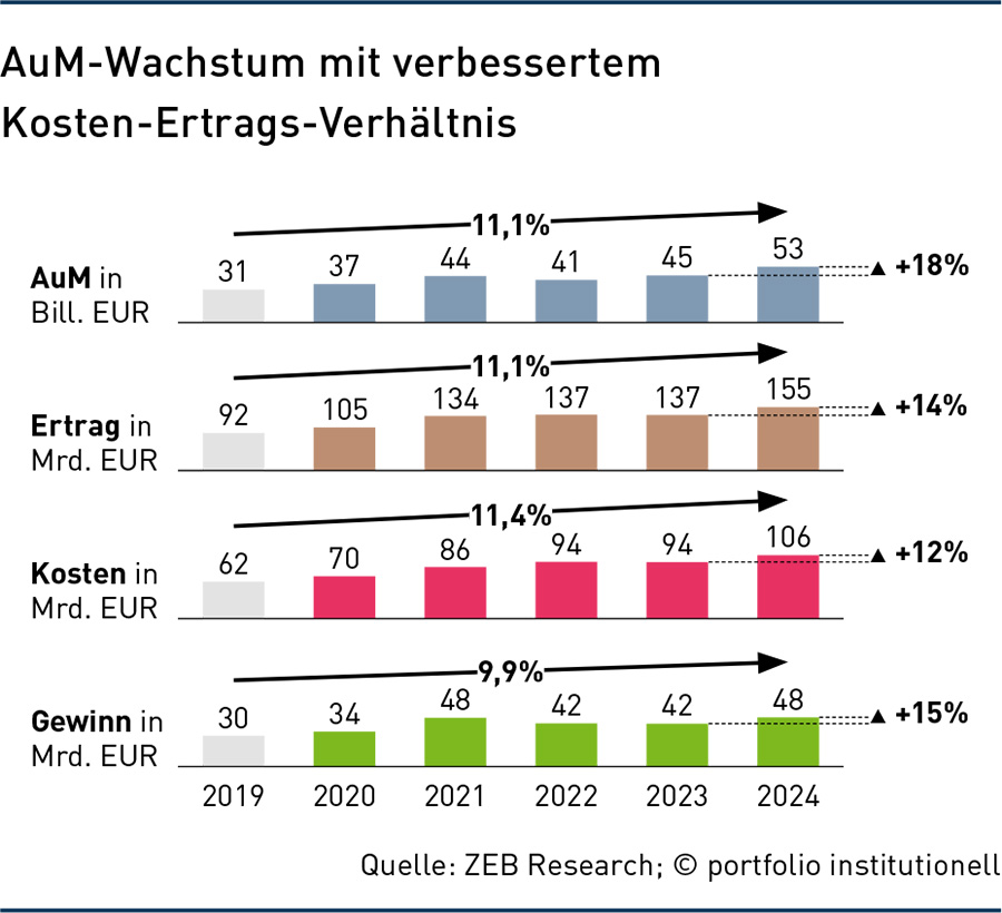 Tendenziell sind die Margen jetzt schon rückläufig. Während die Assets under Management in der ZEB-Analyse in den vergangenen fünf Jahren um 11,1 Prozent per annum zulegten, stiegen die Kosten in diesem Zeitraum um 11,4 Prozent und der Gewinn nur um 9,9 Prozent. Ein Menetekel könnte 2024 sein: Im eigentlich guten vergangenen Jahr kletterten die AuM um 18 Prozent, der Ertrag legte aber nur um 14 Prozent zu. „Die Kosten steigen stärker als das Asset-Volumen. Zudem sind die Kosten, bedingt durch regulatorische Aufwendungen und Investitionen in die Digitalisierung, fix und von der AuM-Entwicklung eher losgelöst als der Ertrag“, erklärt Wittrock. Die Folge: Fallende Börsenkurse machen sich in der GuV der Asset Manager deutlich negativ bemerkbar.