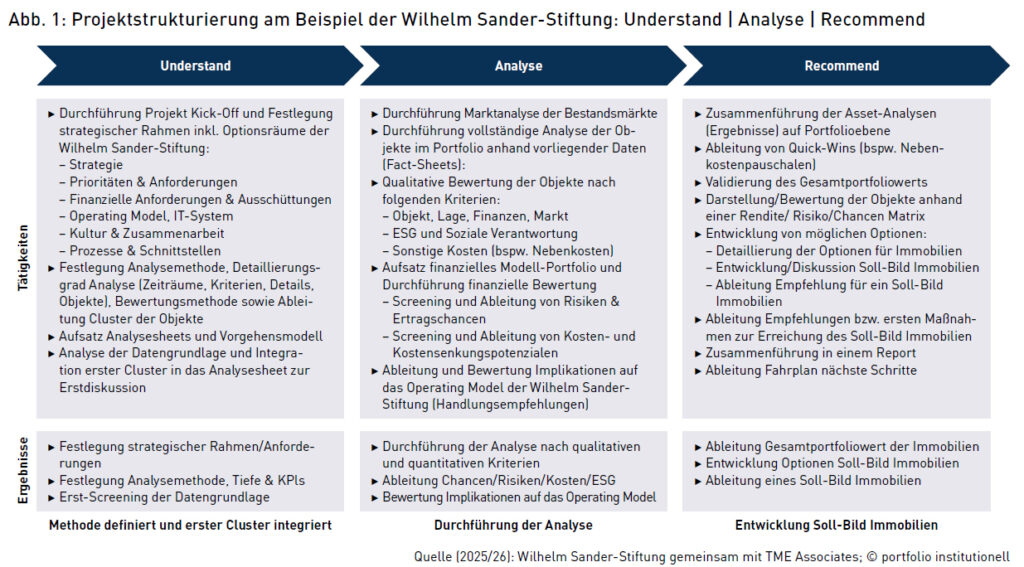 Vor diesem Hintergrund entschied sich die Stiftung, gemeinsam mit TME Associates eine umfassende Optimierungsanalyse des Immobilienportfolios durchzuführen (Abb. 1). Das Ziel war es, Transparenz zu schaffen, strategische Entscheidungsgrundlagen zu entwickeln und das Immobilienvermögen systematisch in die Gesamtvermögenssteuerung einzubetten. TME Associates ist auf die strategische Beratung institutioneller Immobilieninvestoren spezialisiert. Der Fokus liegt auf Asset- und Portfoliostrategien sowie Interimsmanagement zur Optimierung der Bewirtschaftung für institutionelle Anleger wie Unternehmen und Stiftungen, Family Offices und andere langfristig orientierte Eigentümer. Der Beratungsansatz verbindet immobilienwirtschaftliche Expertise mit finanzwirtschaftlichen Methoden der Asset-Allokation und des Risikomanagements.