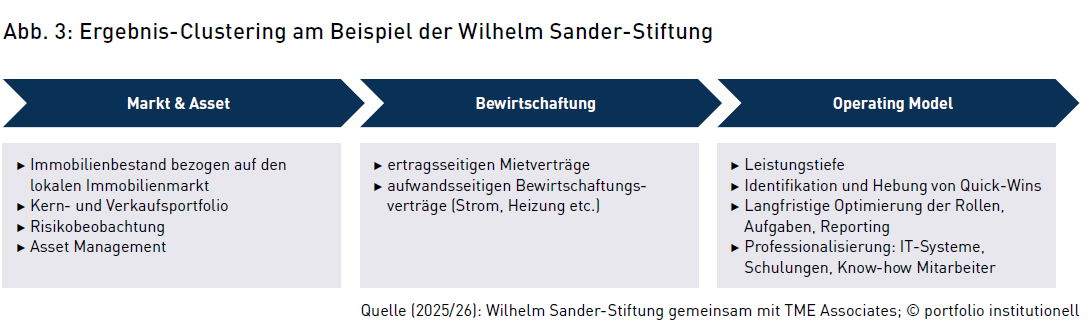 Im Rahmen der Optimierungsanalyse konnten bei der Wilhelm Sander-Stiftung die im Schaubild auf Seite 18 aufgeführten Punkte nach Ergebnis-Clustern dargestellt werden und anschließend als Entscheidungsgrundlage für Implementierungen dienen. Dieses Vorgehen ist nötig, da jede Immobilie auf der Grundlage fundierter Entscheidungen gesteuert werden sollte. Dabei ist das Zusammenspiel von Asset Management, Objektmanagement und Facility Management von zentraler Bedeutung. Standards, klare Rollen- und Prozessgestaltungen sowie eine professionelle Steuerung sind keine Einschränkung, sondern eine Voraussetzung dafür, dass Immobilien auch künftig zuverlässig zur Erfüllung des Stiftungszwecks beitragen können. Die Herausforderung besteht darin, wirtschaftliche Vernunft, langfristige Perspektive und stiftungsspezifische Verantwortung (Ausschüttung) über eine stiftungsindividuelle Immobilienstrategie dauerhaft in Einklang zu bringen. Immobilien sind keine passiven Vermögenswerte mehr, sondern zunehmend aktive Geschäftsmodelle mit Chancen und Risiken. Eine reine Verwaltung mit pauschalen Renditevorstellungen ist nicht mehr möglich. Aufgrund der zunehmenden Komplexität in der Immobilienbewirtschaftung sind heute für jede Immobilie agile Bewirtschaftungsmodelle erforderlich.
