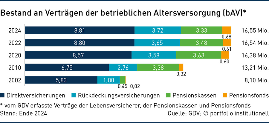 Zudem legten 2024 Rückdeckungsversicherungen im Bestand um 0,4 Prozent sowie Pensionsfonds um 5,2 Prozent zu, während Pensionskassen 2,33 Prozent einbüßten. Den Anteil der bAV am Neugeschäft der Lebensversicherer gibt der GDV erneut nicht an. Traditionell dürfte er weiter bei knapp 20 Prozent liegen.