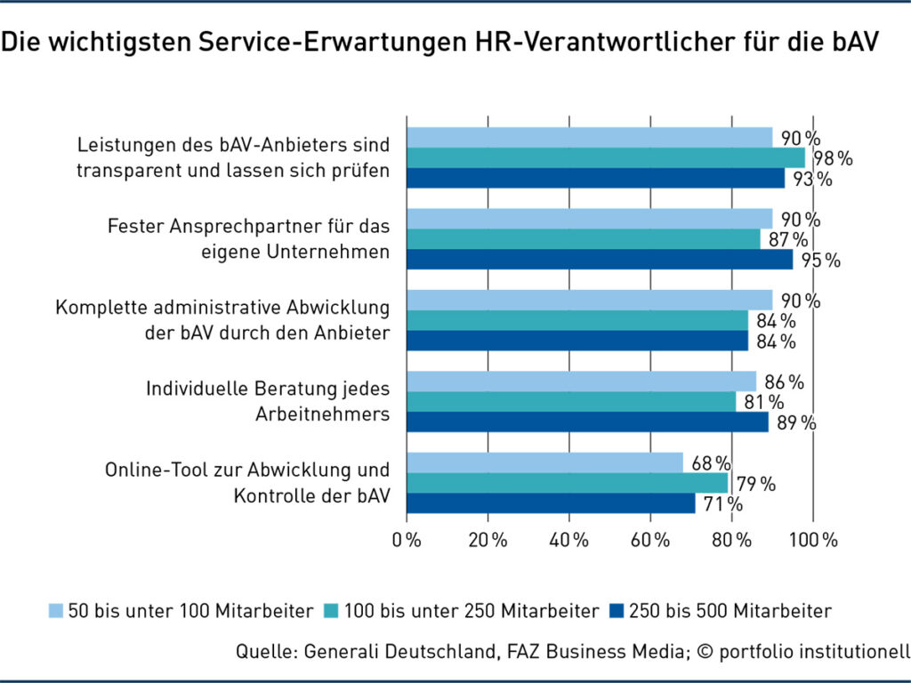 Aktuell bieten 87 Prozent der Mittelständler die Direktversicherung an, vielfach als beitragsorientierte Leistungszusage (BoLZ), 46 Prozent eine Pensionskassenzusage und 22 Prozent eine Pensionsfondslösung (Mehrfachnennungen erlaubt), besagt die Studie „Betriebliche Altersversorgung im Mittelstand 2024“ von Generali Deutschland und F.A.Z. Business Media auf Basis einer Forsa-Umfrage unter 200 HR-Verantwortlichen in Unternehmen mit 50 bis 500 Mitarbeitern.